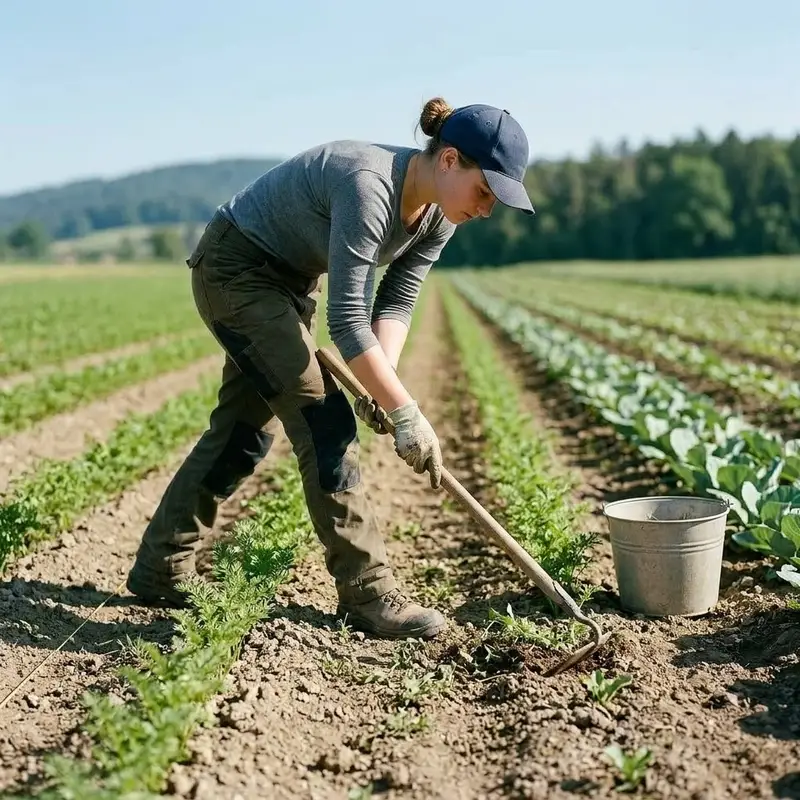 "description": "Du jätst Unkraut zwischen den Gemüsereihen mit der Hacke auf dem Feld, damit die Pflanzen Licht und Platz haben.",