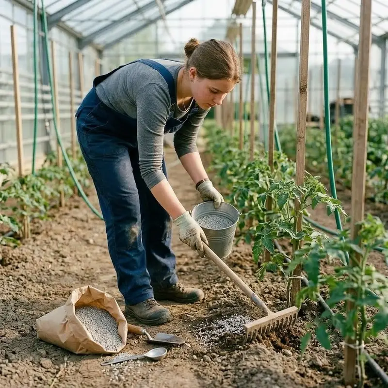 "description": "Du streust Dünger um die Pflanzen und arbeitest ihn mit einem Rechen in den Boden ein.",