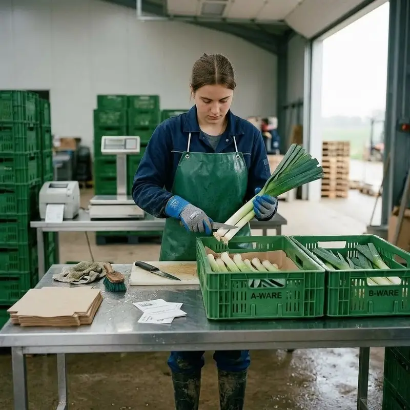 "description": "Du erntest reifes Gemüse mit einem Messer, sortierst es an einem Arbeitstisch und verpackst es in Kisten für den Verkauf.",