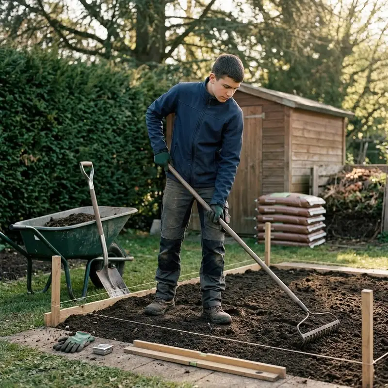 Du legst in einem Garten neue Beete an, verteilst Erde und Kompost mit Schaufel und Schubkarre und ziehst die Fläche mit einem Rechen glatt.