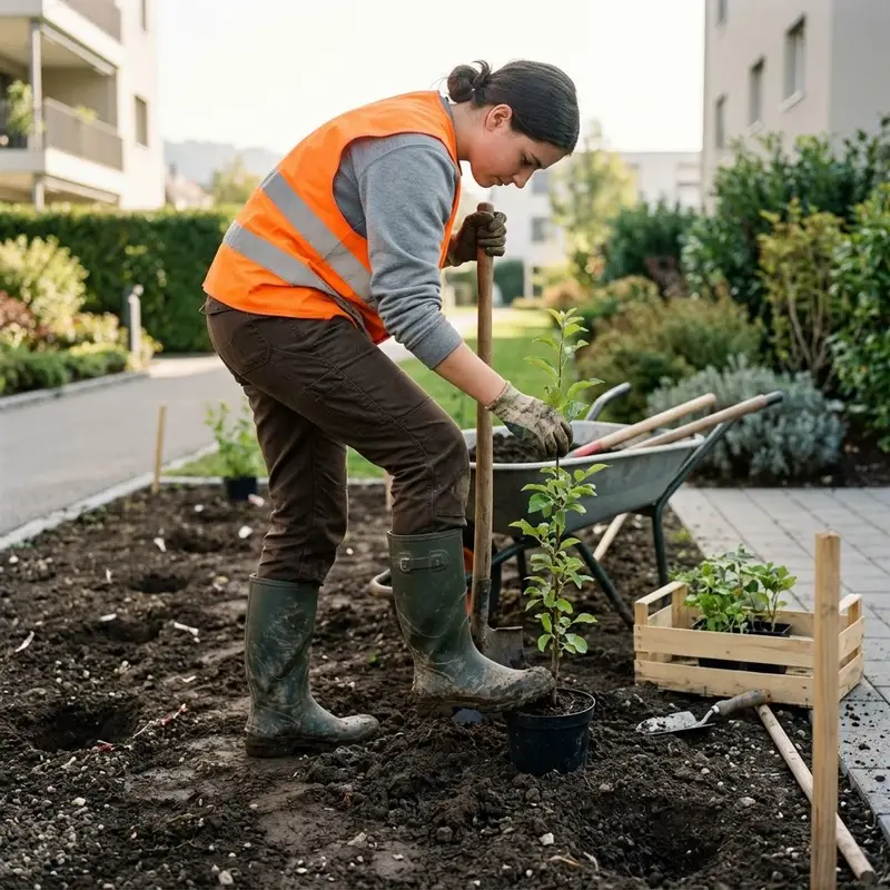 "description": "Du pflanzt draussen Jungpflanzen, Blumen oder einen Baum in vorbereitete Pflanzlöcher und trittst die Erde mit den Stiefeln fest.",