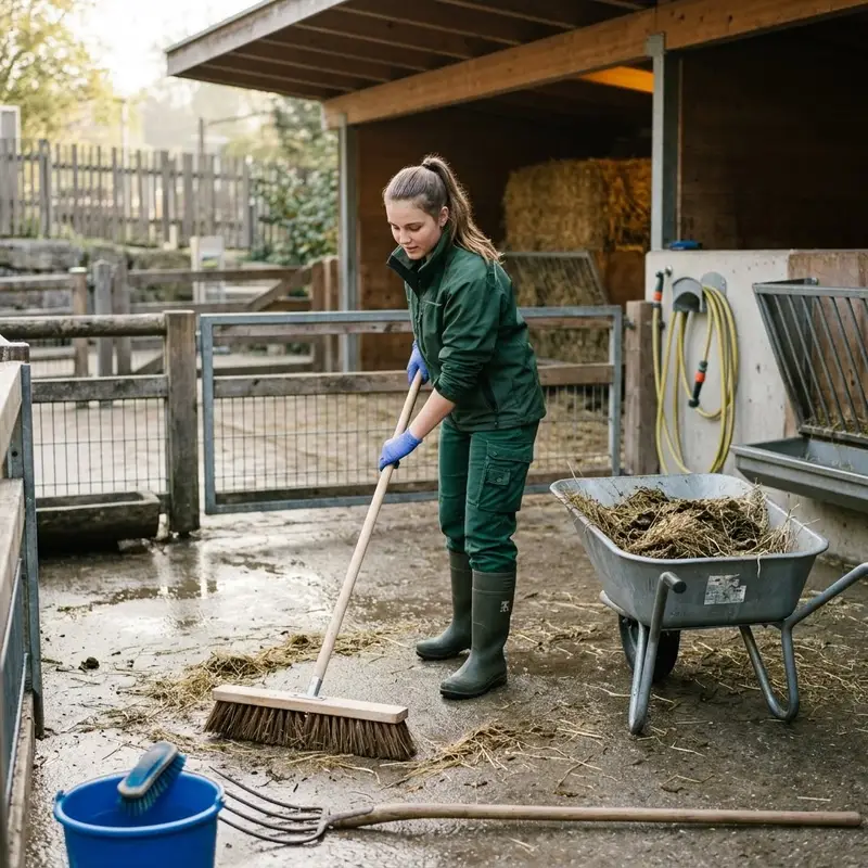 "description": "Du kehrst den Boden im Tiergehege, wechselst das Heu und schrubbst die Schlafplätze mit Bürste und Wasser.",