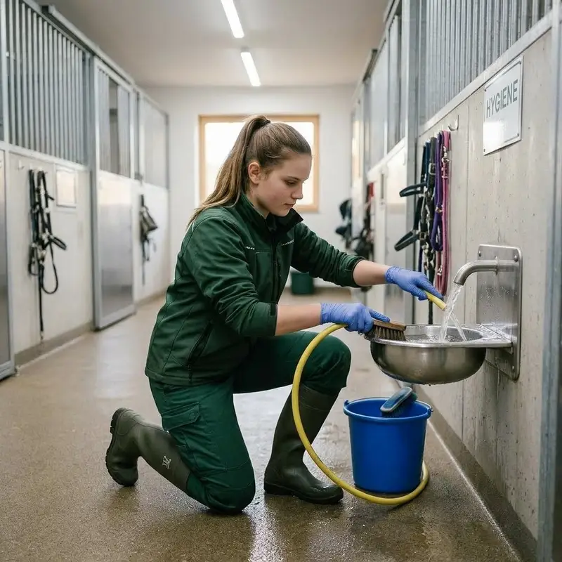 "description": "Du spülst die Trinknäpfe aus und füllst sie im Stall mit frischem Wasser aus dem Schlauch auf.",