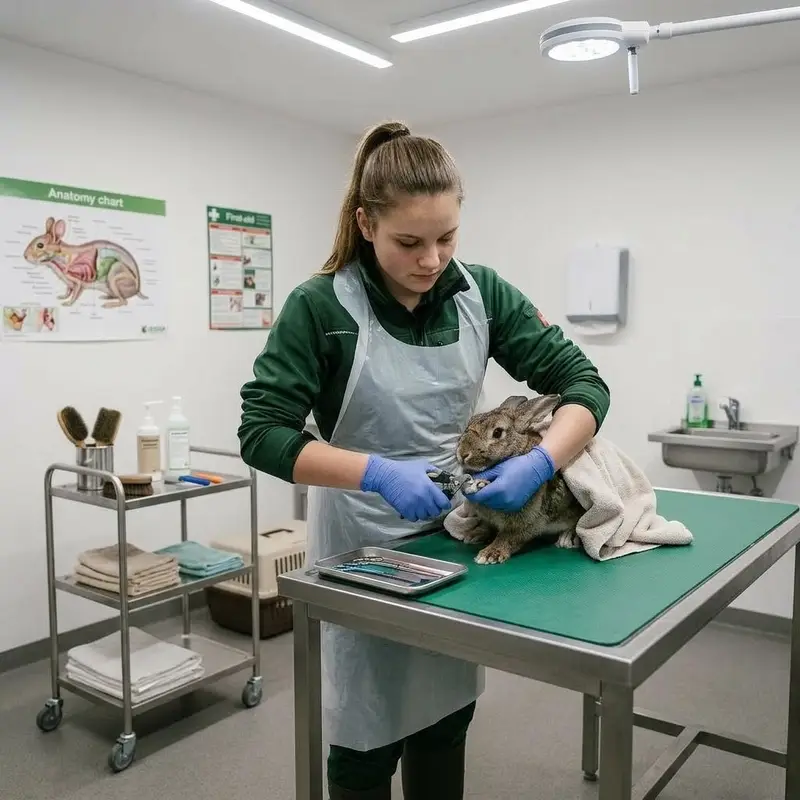 "description": "Du hältst ein Tier ruhig fest und kämmst sein Fell oder schneidest ihm mit einer Zange die Krallen im Pflegeraum.",