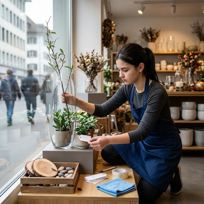 "description": "Du stellst Pflanzen und Vasen ins Schaufenster, platzierst Preisschilder und richtest die Deko im Verkaufsraum aus.",