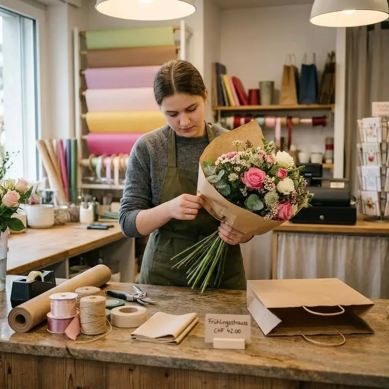 "description": "Du wickelst den Strauss am Verkaufstresen in Papier, fixierst ihn mit Schleifenband und legst ihn in eine Tragetasche.",