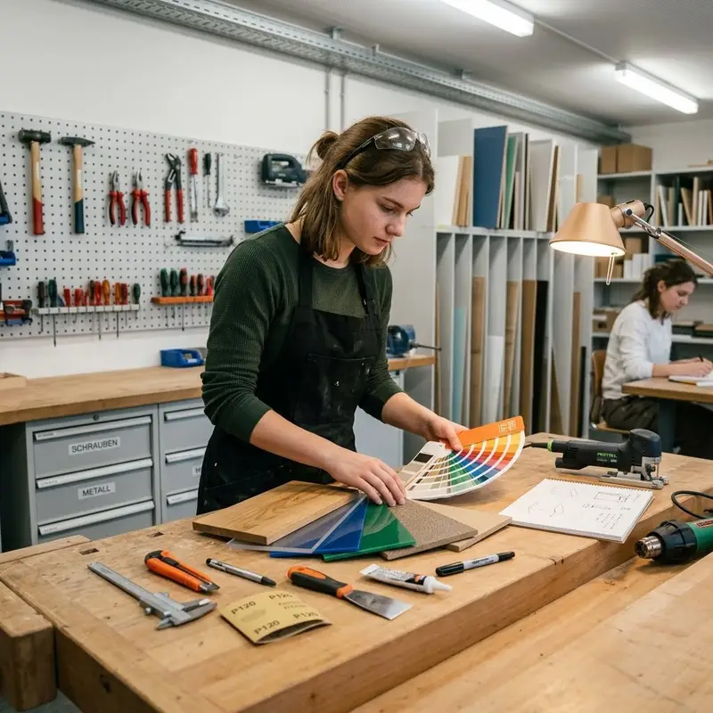 "description": "Du legst Muster von Holz, Kunststoff und Farbe auf den Arbeitstisch und wählst die passenden Werkzeuge in der Werkstatt aus.",