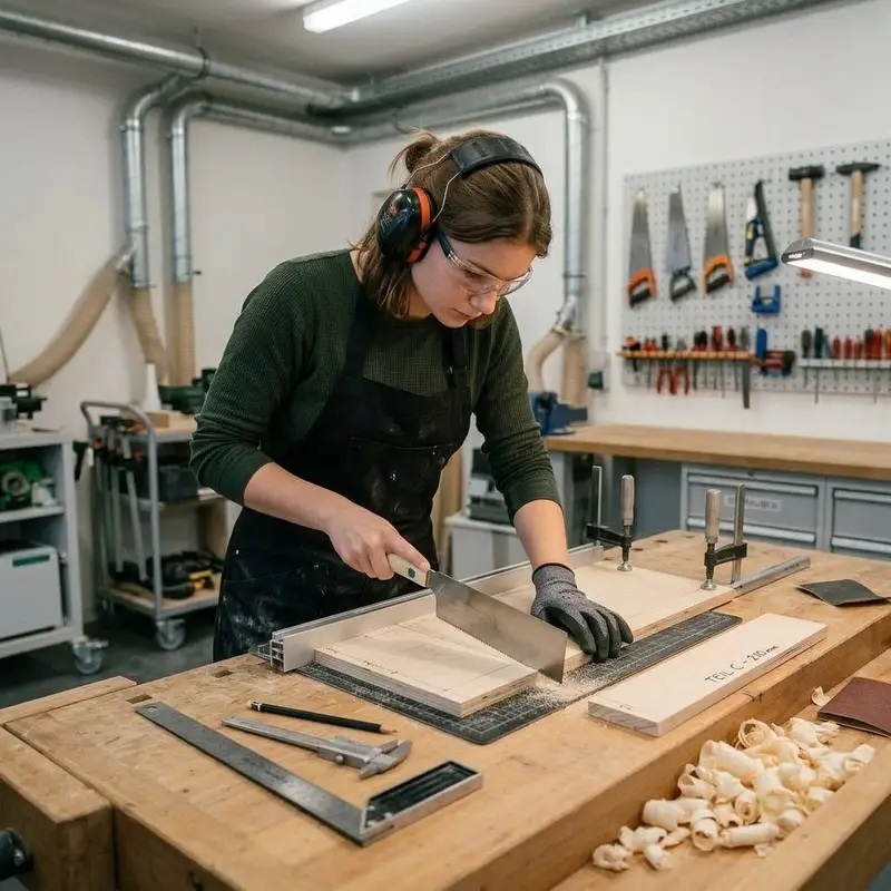 "description": "Du sägst und schneidest die ausgewählten Materialien an der Werkbank millimetergenau zu.",