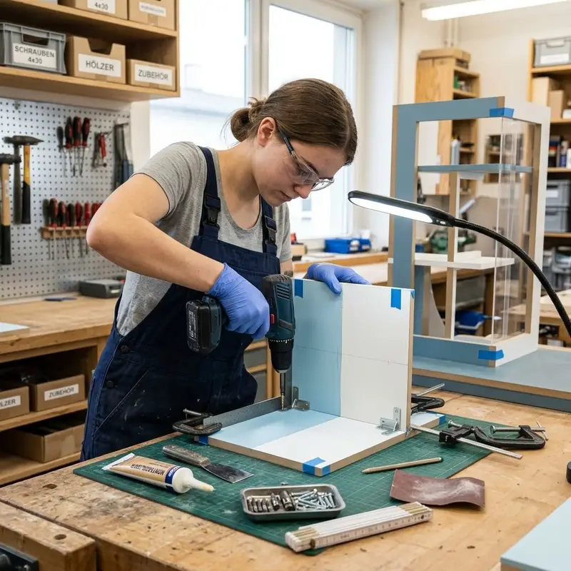 "description": "Du setzt alle Teile auf einem Montagetisch zusammen und klebst oder verschraubst sie zu einer stabilen Installation.",
