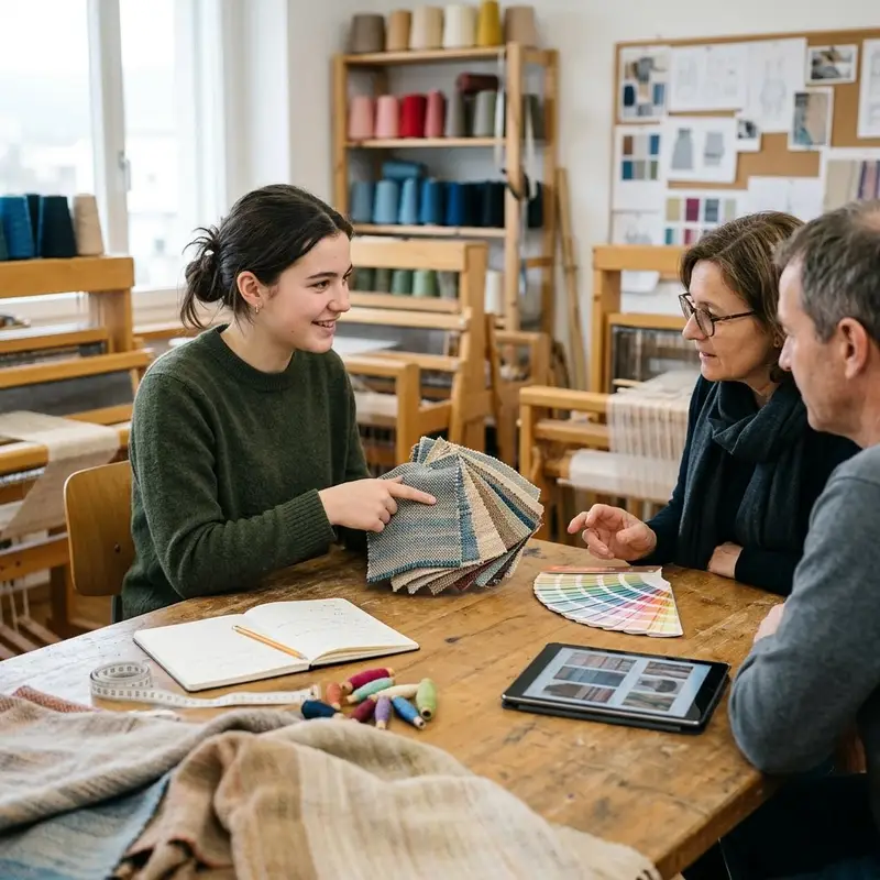 "description": "Du sitzt mit Kundinnen und Kunden im Atelier am Mustertisch, zeigst Stoffproben und besprichst ihre Wünsche für ein individuelles Textil.",