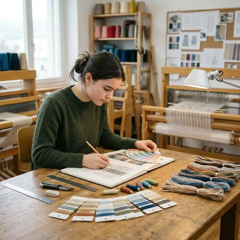 "description": "Du zeichnest am Arbeitstisch ein neues Muster, wählst Farbkarten aus und legst Garnproben für das Design daneben.",