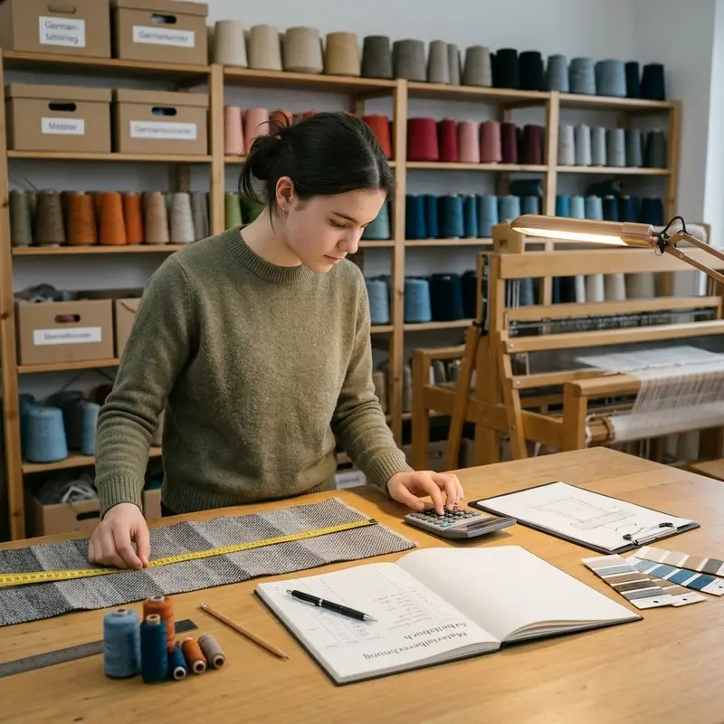 "description": "Du misst die geplante Stoffgrösse, rechnest am Rechner die benötigte Garnmenge aus und notierst die Materialliste im Arbeitsbuch.",