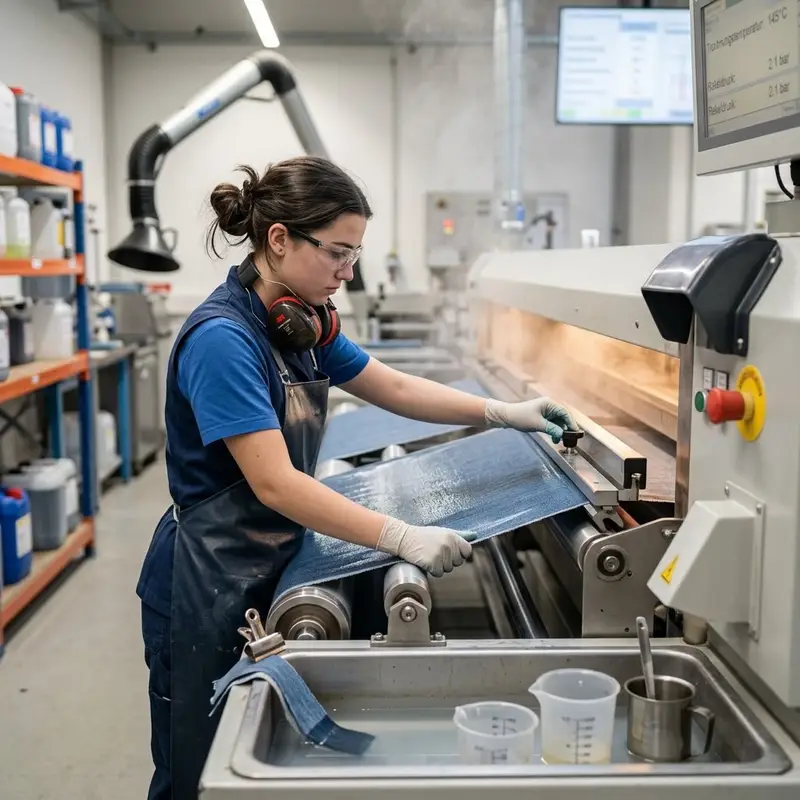 "description": "Du führst die Stoffbahn durch eine Veredelungsanlage und trägst Farbe, Beschichtung oder Finish auf, bevor du das Material trocknest.",