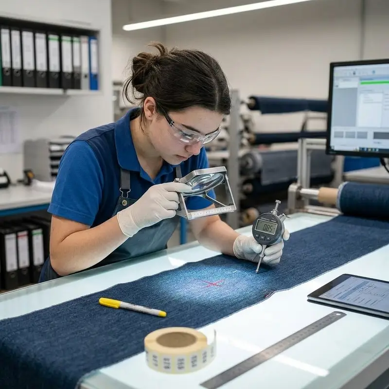 "description": "Du kontrollierst den fertigen Stoff am Leuchttisch mit Messgerät und Lupe und markierst Fehlerstellen direkt auf der Bahn.",