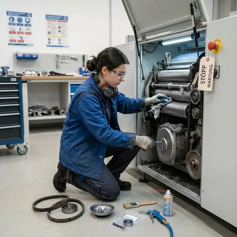 "description": "Du stoppst die Maschine, reinigst sie mit Werkzeug und Schmiermittel und tauschst verschlissene Teile in der Werkstatt aus.",