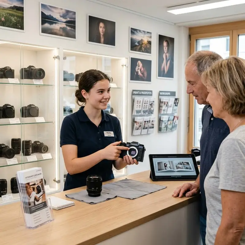 "description": "Du berätst Kundinnen und Kunden im Fotoladen am Verkaufstresen zu Kameras, Objektiven und Fotodienstleistungen.",
