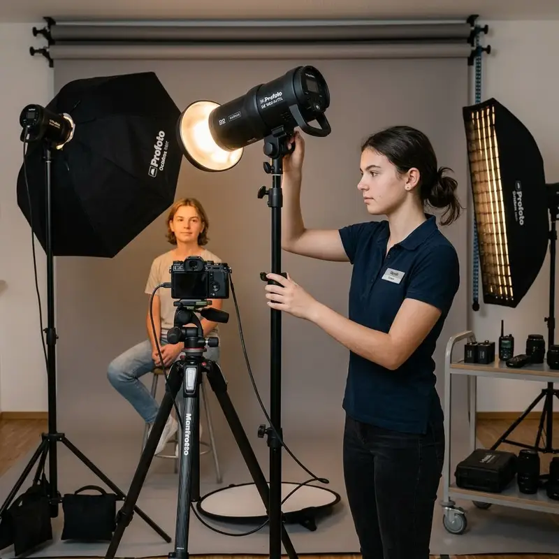 "description": "Du fotografierst eine Person im Studio mit Kamera, Stativ und Blitzanlage und richtest das Licht gezielt aus.",