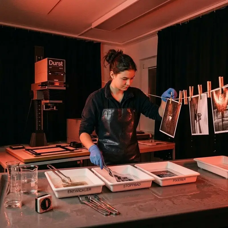 "description": "Du entwickelst belichtetes Fotopapier in der Dunkelkammer in Entwickler- und Fixierbädern und hängst die Abzüge zum Trocknen auf.",