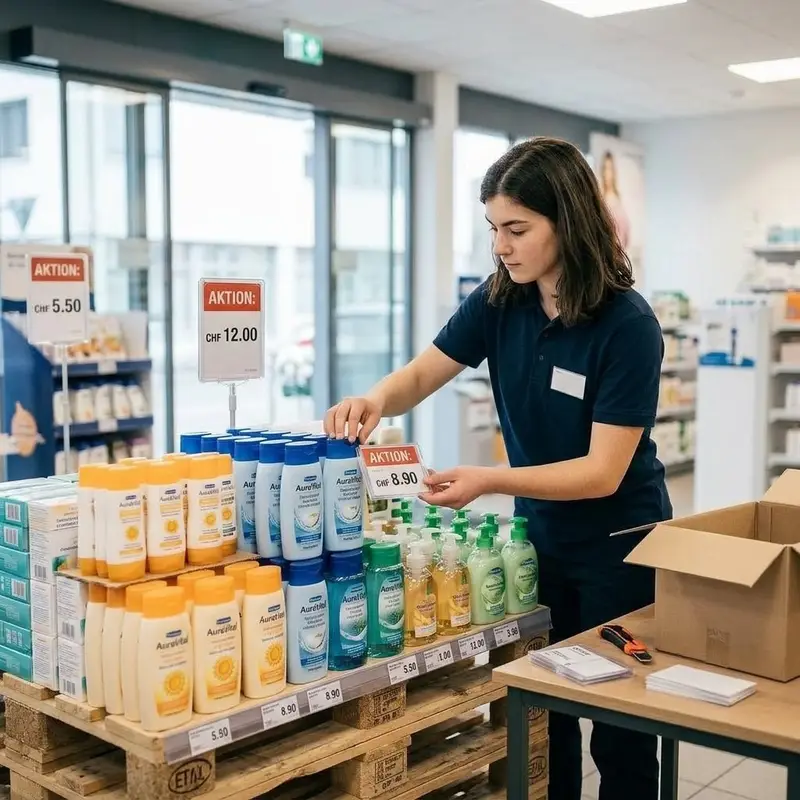 "description": "Du baust eine Aktionsfläche auf und platzierst ausgewählte Produkte mit Preisschildern gut sichtbar.",
