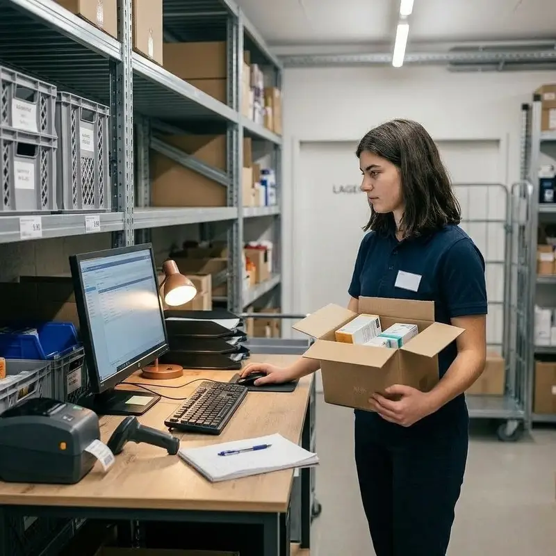"description": "Du prüfst im Lager den Bestand und bestellst fehlende Artikel am Computer nach.",
