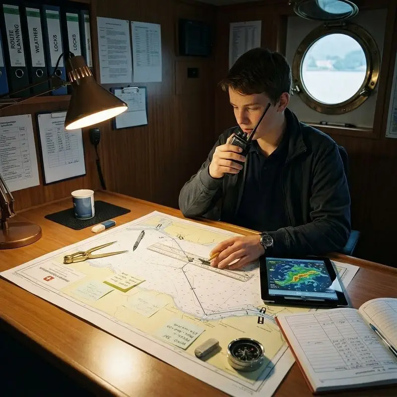 "description": "Du planst am Kartentisch die Route mit Seekarte und Funkgerät und legst die Fahrzeiten nach Wetter und Schleusen fest.",