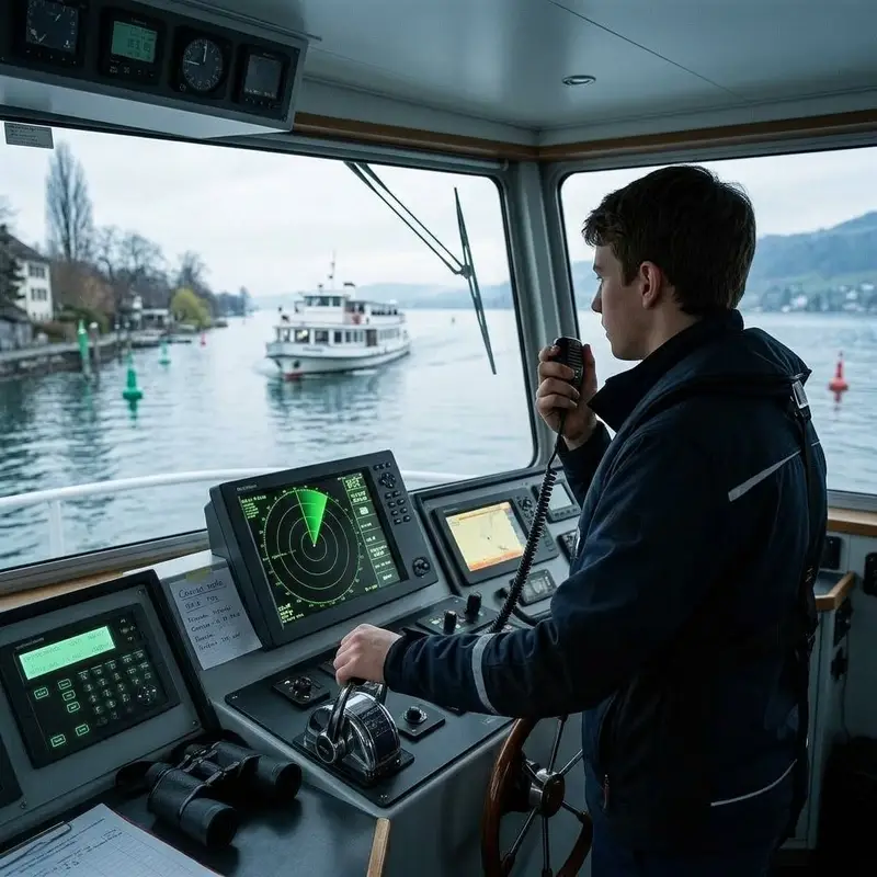 "description": "Du beobachtest Radar und Wasserstrasse, gibst über Funk und Signalhorn Manöverzeichen und passt Geschwindigkeit und Richtung an.",