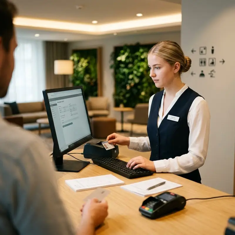 "description": "Du prüfst am Computer die Reservation, scannst Ausweise und übergibst den Zimmerschlüssel am Empfangstresen.",