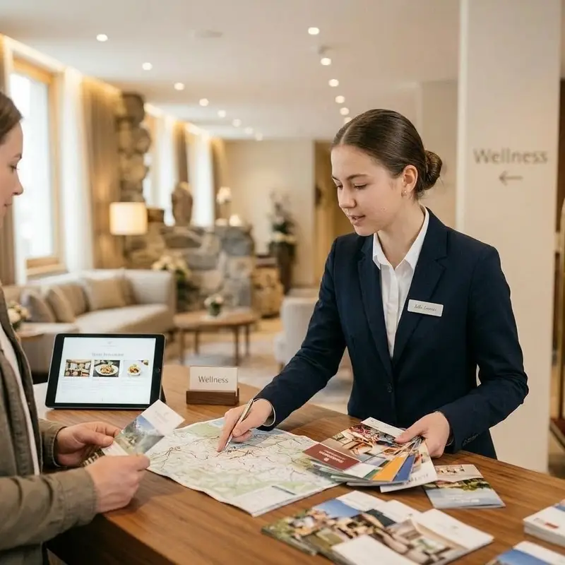 "description": "Du zeigst Gästen am Empfang Prospekte und Karten und erklärst Restaurant, Wellness und Ausflugsmöglichkeiten in der Umgebung.",
