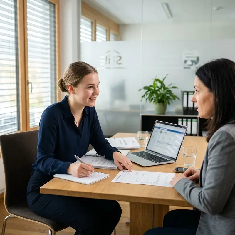 "description": "Du sitzt mit einer Kundin am Beratungstisch und stellst Fragen zu ihrer Lebenssituation und ihren Risiken.",